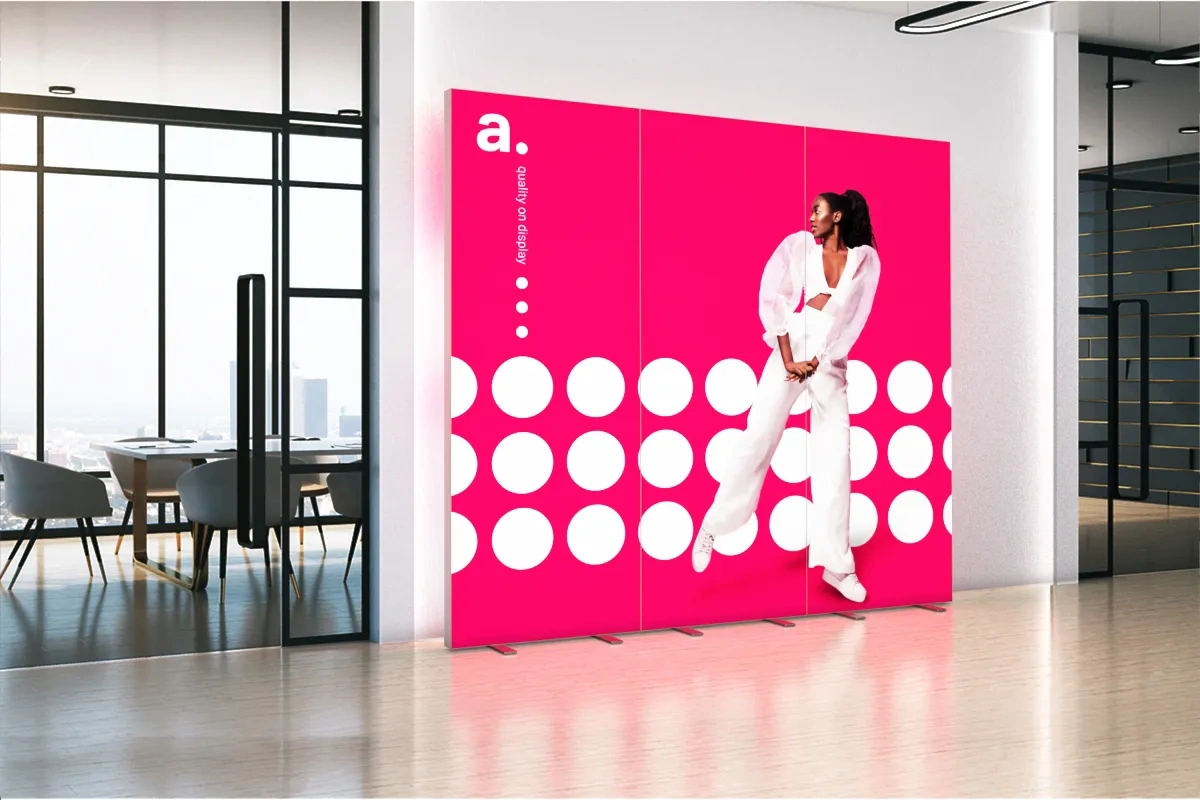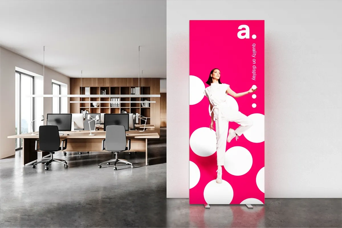 adFrame Quick 2.0 es una caja de luz LED publicitaria de doble cara para stands de feria, con estructura ligera e impresión textil de alta calidad. Los imanes integrados en el marco permiten unir varias cajas de luz en una exposición más grande y continua – sin necesidad de herramientas ni accesorios adicionales. Este sistema autoportante es una alternativa llamativa al clásico roll-up, ideal para destacar en ferias y eventos.